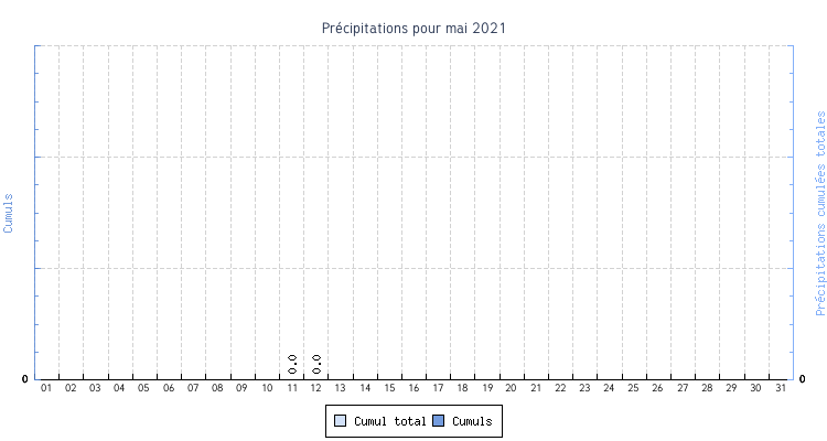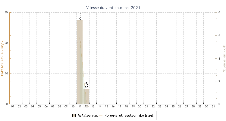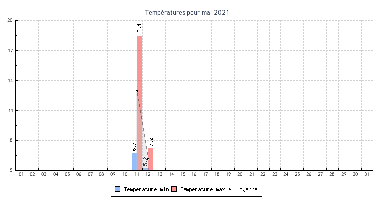 | 11 | 6.7 °C à 23:43 | 18.4 °C à 17:07 | 12.9 °C | 5.8 km/h (27.4 km/h) |  288 | 0.0 mm |