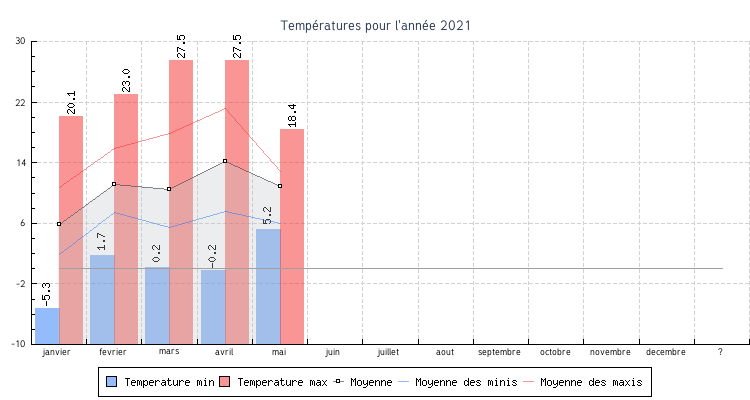 | avril | -0.2 °C | 7.5 °C | 27.5 °C | 21.2 °C | 14.1 °C | 5.8 km/h | 31.3 km/h | 298 |