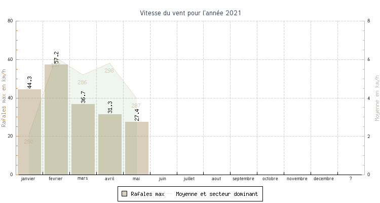 | janvier | -5.3 °C | 1.9 °C | 20.1 °C | 10.7 °C | 5.8 °C | 2.1 km/h | 44.3 km/h | 280 |